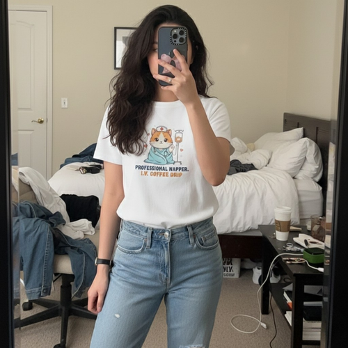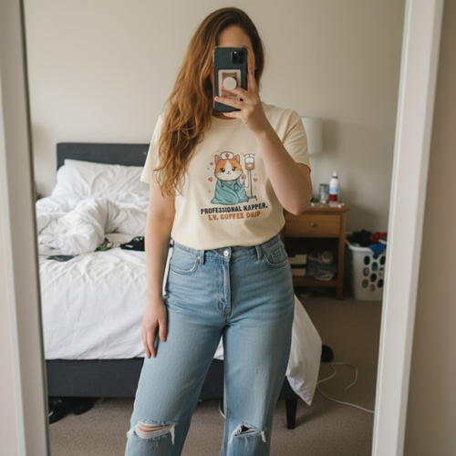 Experience unparalleled comfort and humor with our unique tee, combining playful design and ethical materials that ensure you excel during your long shifts.