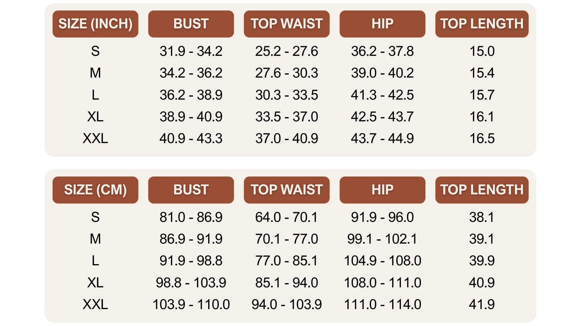 Choosing the right size is crucial for the best fit and support. Refer to our sizing chart to find your perfect match based on your measurements. If in doubt, opting for a size up ensures comfort without compromising on shaping benefits.